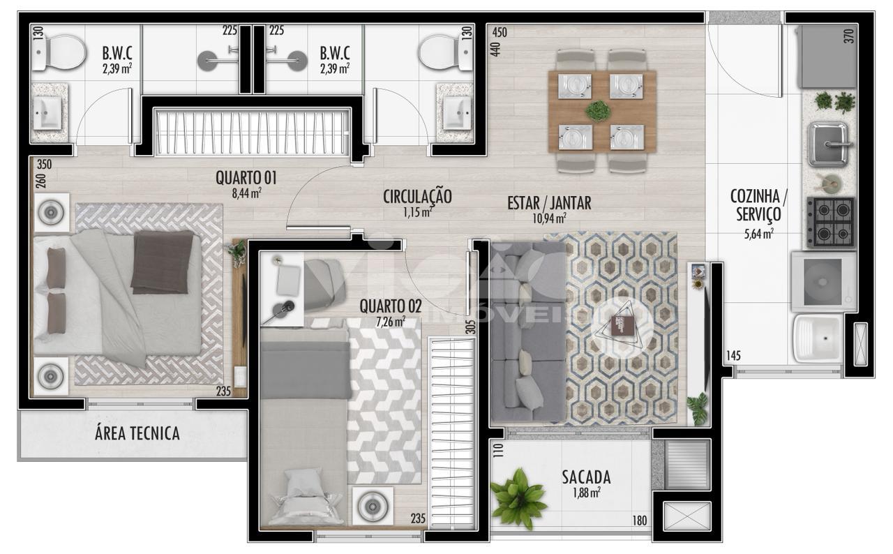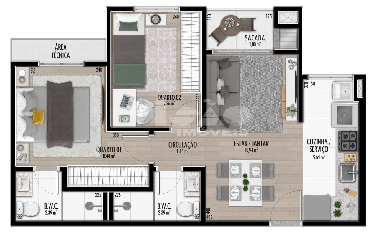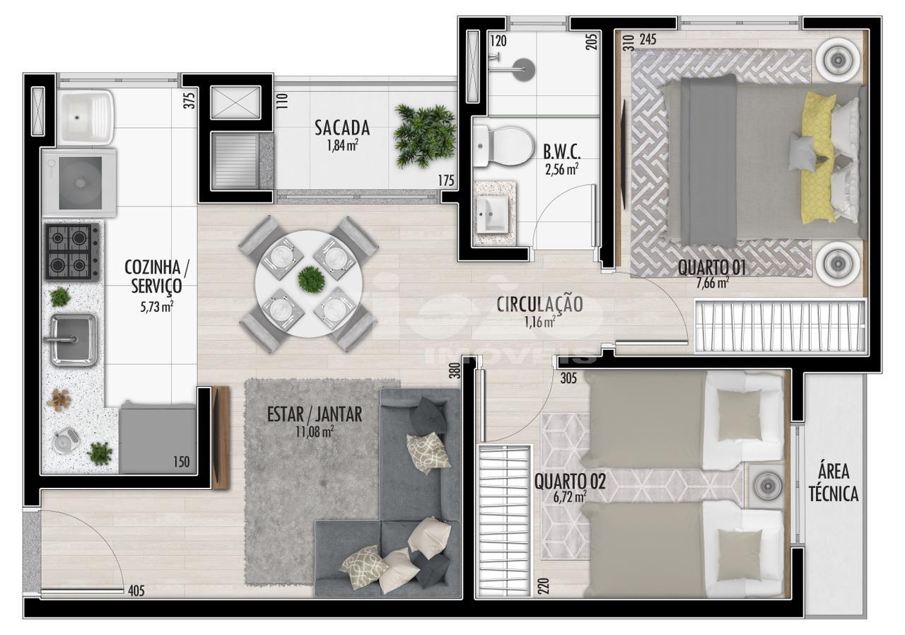 O empreendimento oferece apartamentos com plantas A, B e C, com opções de 1 e 2 dormitórios, com e sem suíte, e metragens a partir de 41,41 m² de área privativa.