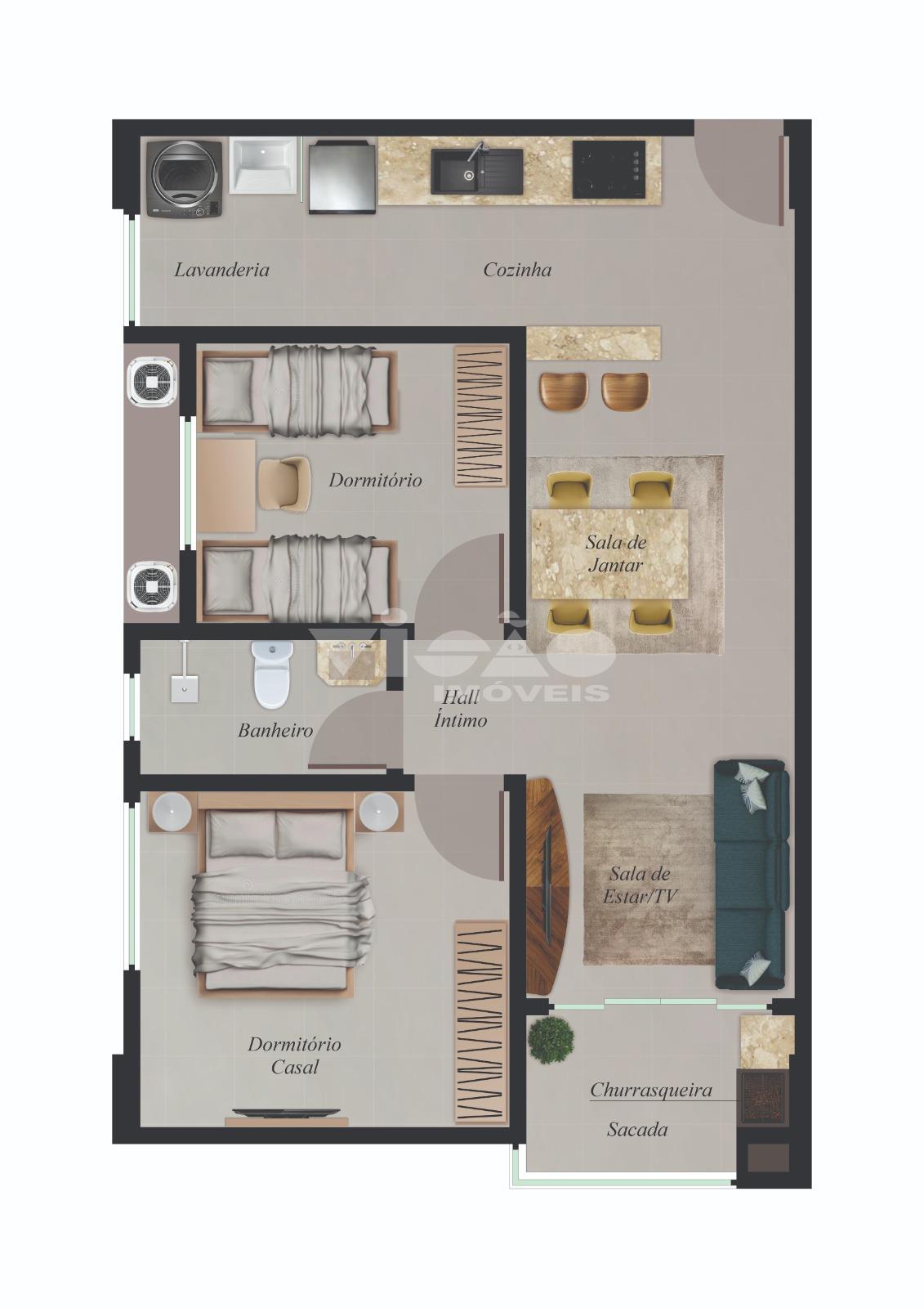 Configuração: 2 dormitórios, sala de estar/jantar integrada, cozinha, área de serviço, banheiro e sacada com churrasqueira.